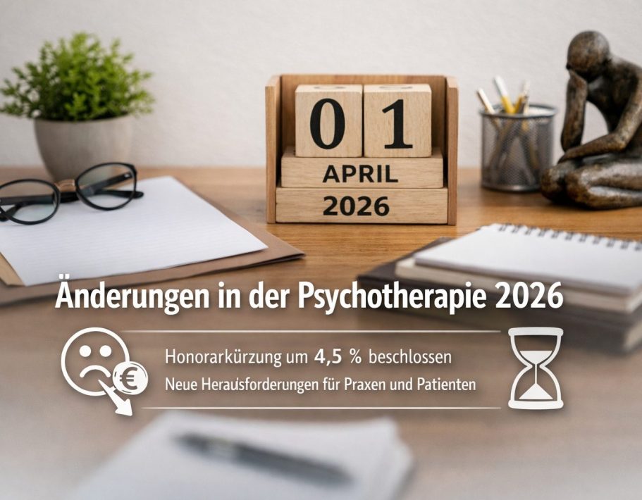 Zum 01.04.2026 wurde die Vergütung für ambulante psychotherapeutische Leistungen bundesweit um 4,5 % abgesenkt. Grundlage ist ein Beschluss des Erweiterten Bewertungsausschusses. Für 2027 sind weitere Kürzungen im Gespräch.